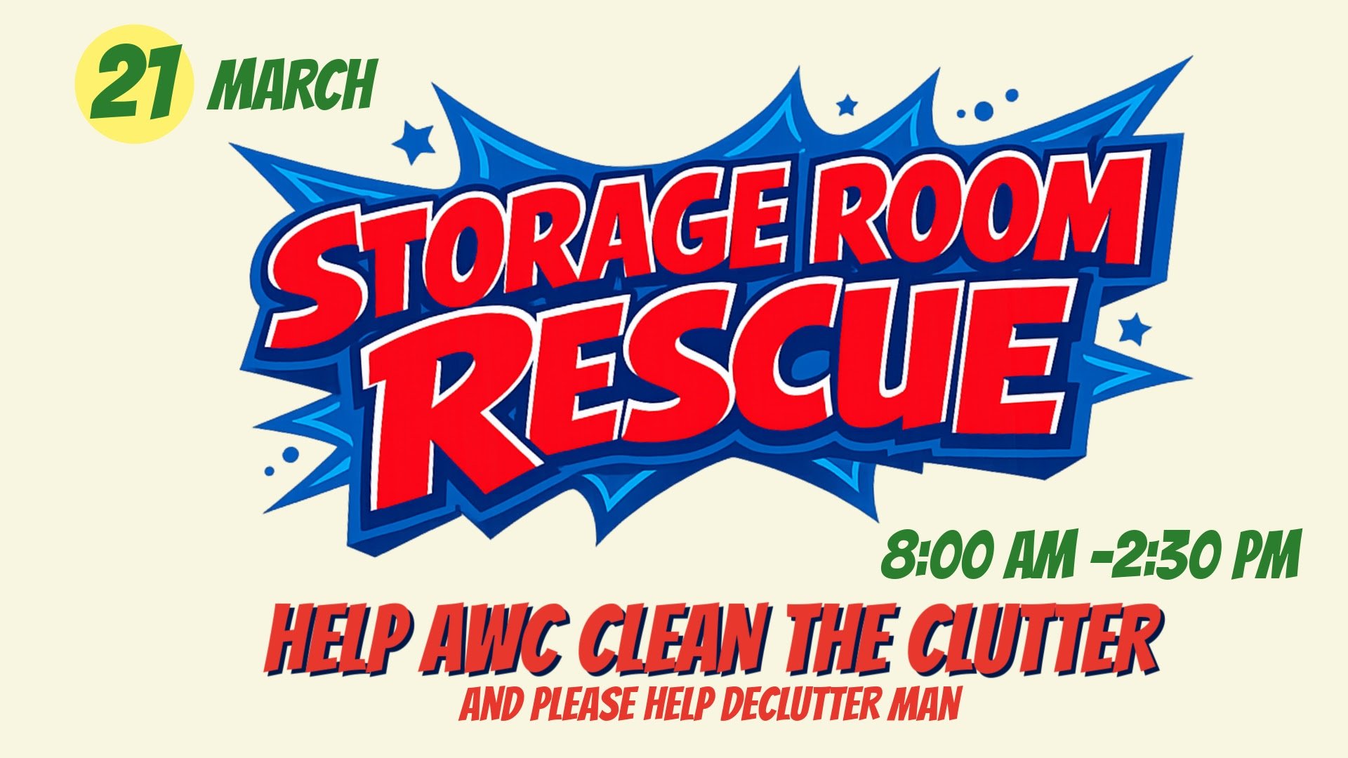 Help us clear the clutter and make room for what’s next! We’re coming together at AWC to organize, revitalize, and "rescue" our storage spaces. Whether you have a gift for organizing or just want to lend a helping hand, your energy is needed! Lunch is provided
